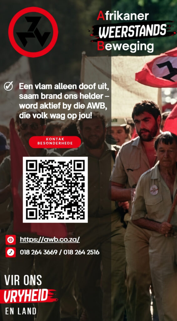 Ons moet ons vyand ken en identifiseer. Ons moet weet wie hulle is !! Ons moet ons stem kan dik maak en ons moet ons rug kan styf maak. Ons moet deurentyd ‘n faktor wees om mee rekening gehou te word. Tyd vir slapgatte en politiek korrekte optrede is iets van die verlede. Ons is geen bywoners op ons eie grondgebied nie. Hierdie land is opgebou met die intelek en finansiële vermoë van die witman tot ‘n eerste rangse wêreld model staat.