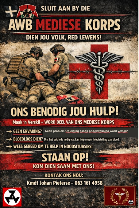 As gevolg van die huidige situasie van onstabiliteit en die moontlike nabye uitbreek van chaos en anargie, sowel as die onwelvoeglike uitsprake van politici is die AWB voltyds besig met die opleiding van sy lede deur middel van huis en haard beskerming, deur goed opgeleide, toegeruste en geakrediteerde instrukteurs en medici. Alles binne die norme van bestaande wetgewing.